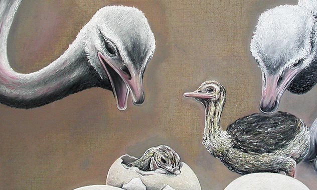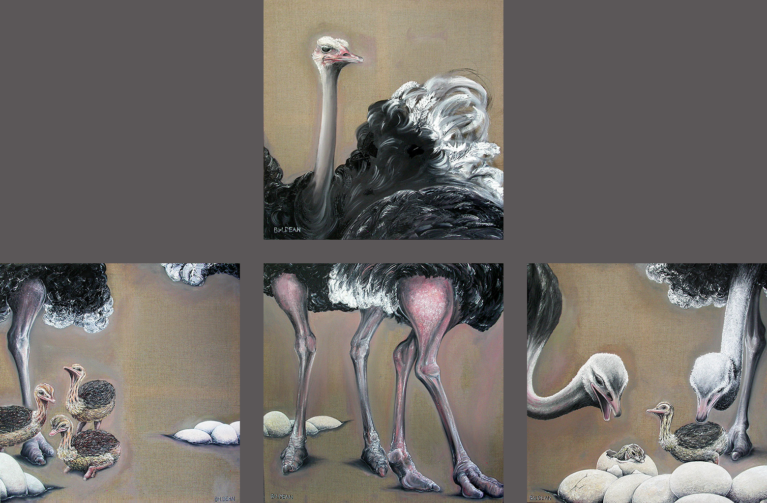 Peinture à l'huile en 4 toiles illustrant la famille des autruches, œufs et autruchons. Huile sur toile de lin, avec certaines parties restées brutes et non peintes.