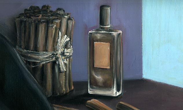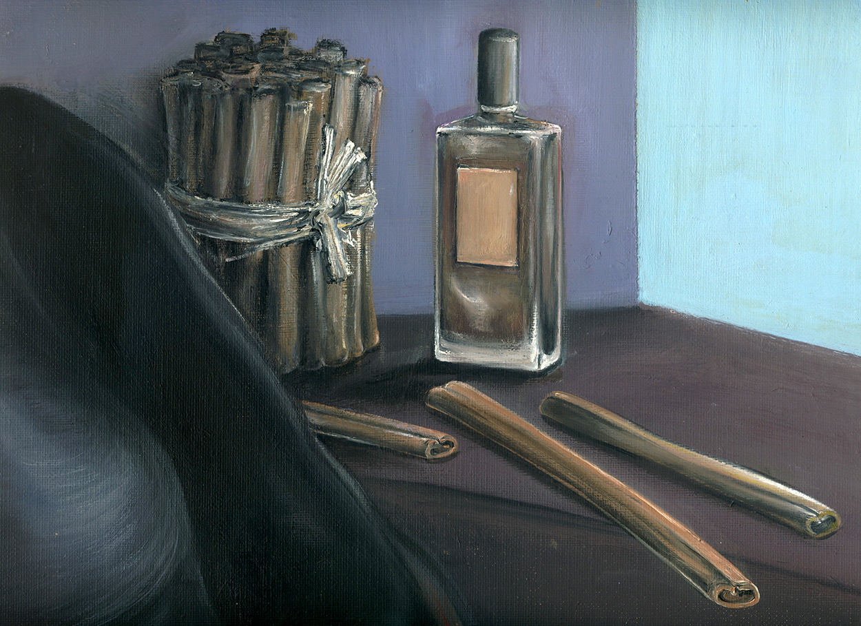 Peinture à l'huile, comme une nature morte, illustrant la cannelle et le parfum à la cannelle, dans un contexte intérieur. Flacon de fragrance Serge Lutens.