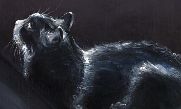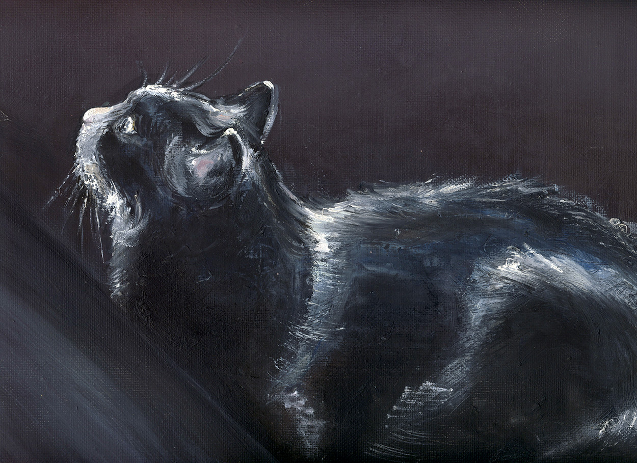 Peinture animalière de chat d'intérieur, à l'huile sur toile. Un effet marquant des couleurs du bleu marine et de la terre d'ombre.