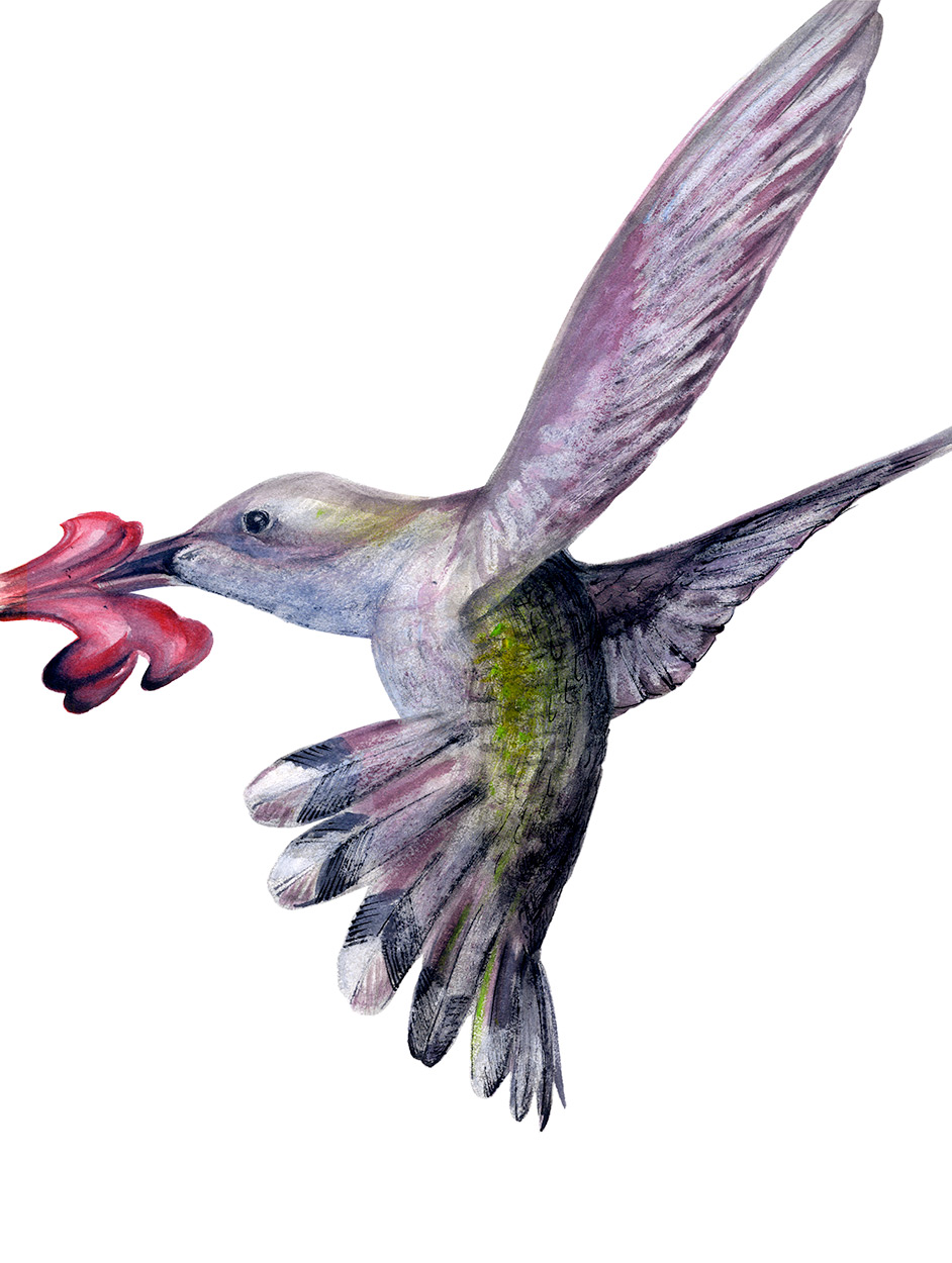 Aquarelle animalière, montrant l'oiseau en plein vol. Mélange d'applats de jus et de traits fins au pinçeau. Fond blanc de papier. Une inspiration de l'ouest américain.