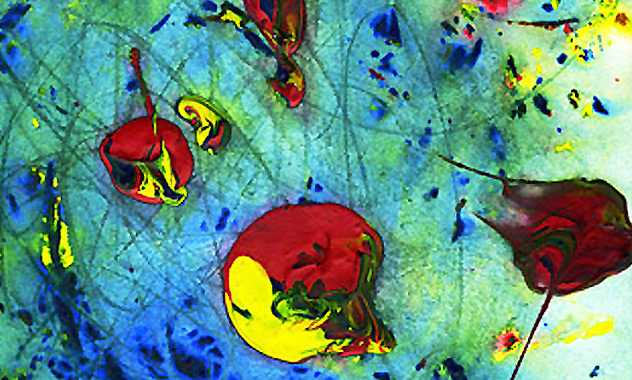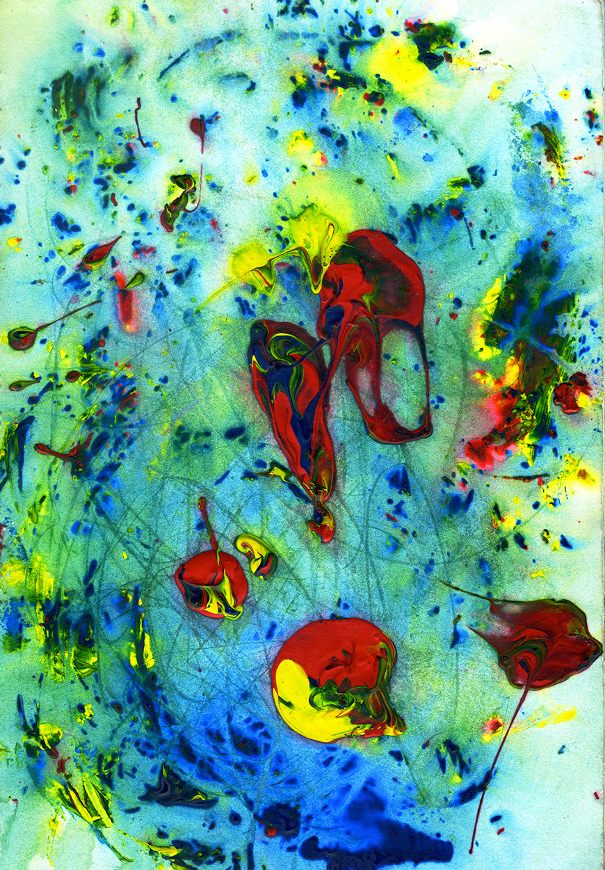 Un effet de matière de peinture acrylique mariné dans l'eau, puis séché et re-travaillé. Couleurs primaires dynamiques en mouvements comme des gouttes.