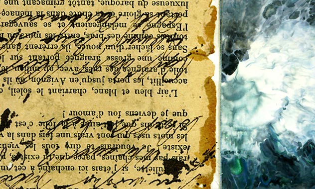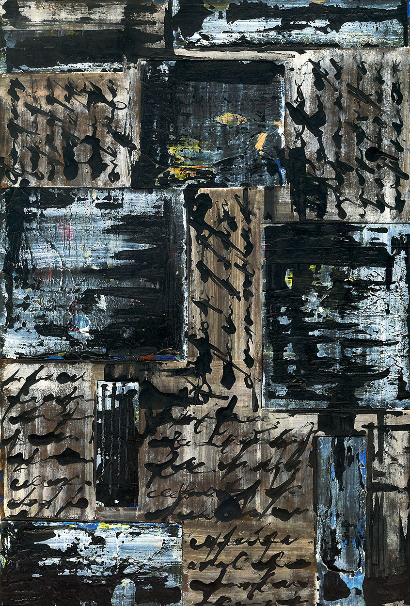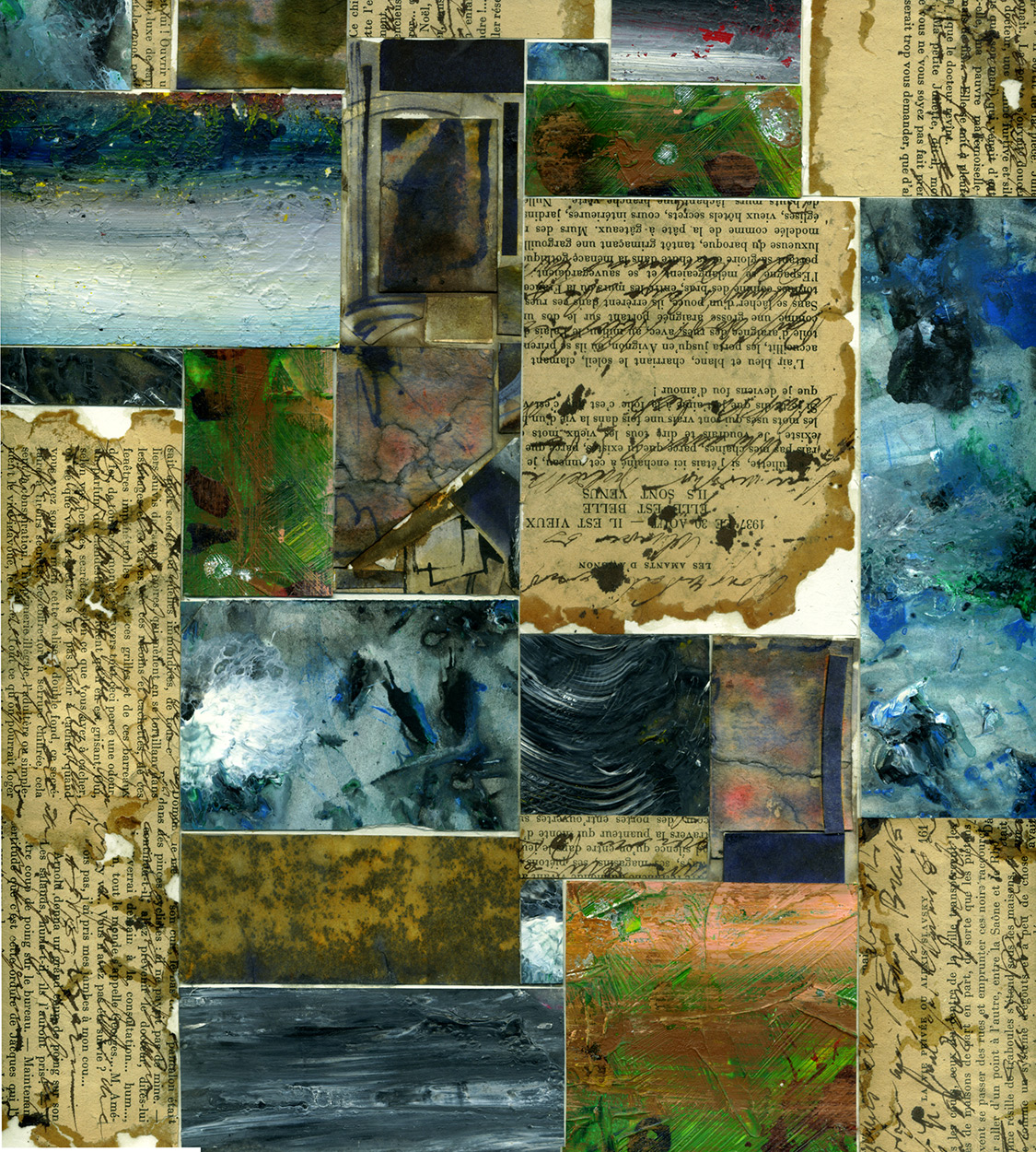 Composition mixte de morceaux d'effets de peinture et d'écriture à l'encre sur vieux papier, un travail de juxtaposition. Le sujet de la composition est incertain.