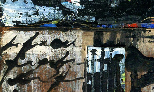 Composition mixte de morceaux d'effets de peinture et d'écriture à l'encre avec bambou, travail de juxtaposition, sujet incertain, équilibre dynamique foncé.