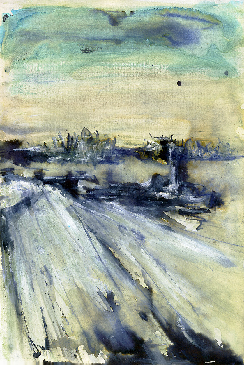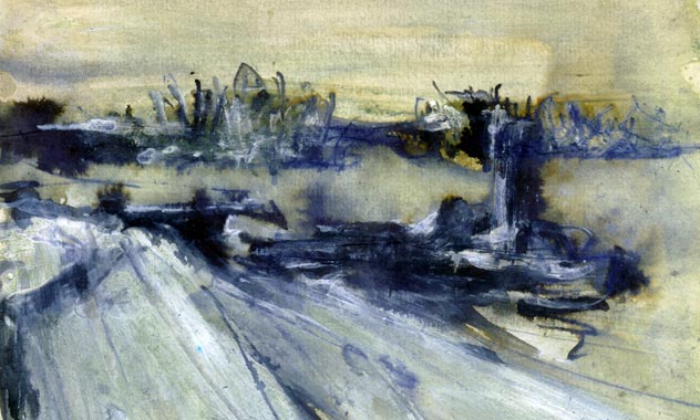 Peinture semi-abstraite d'une vue du fleuve d'Orléans, France, montrant le mélange d'habitations et de côtes rurales proche de la ville. Peinture et encre.