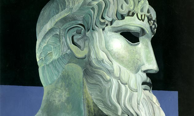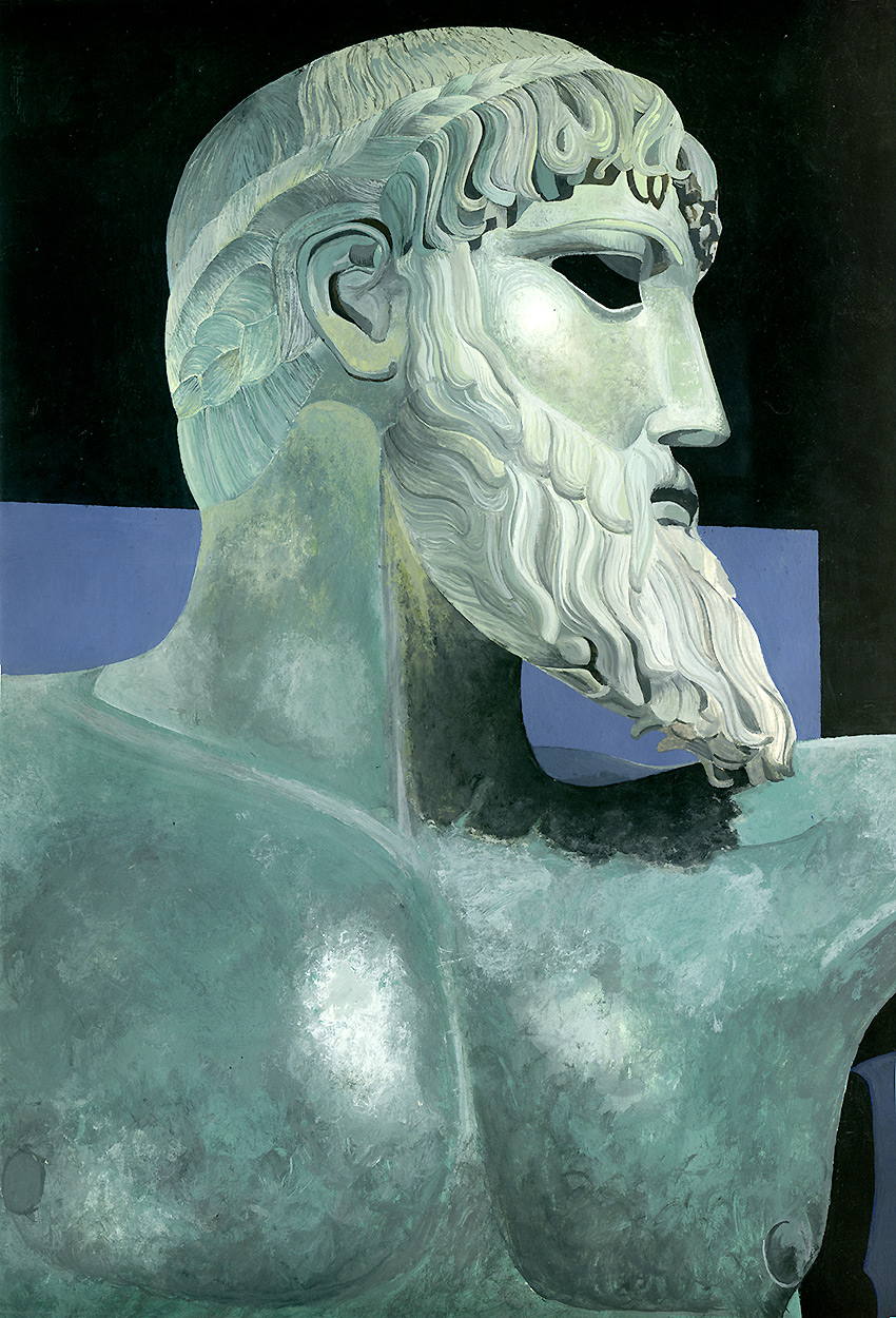 Reproduction à la gouache, à partir d'une photo de sculpture grecque monumentale en bronze, de Zeus ou Poséidon. Un travail de détail avec un rendu très contrasté.