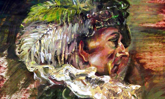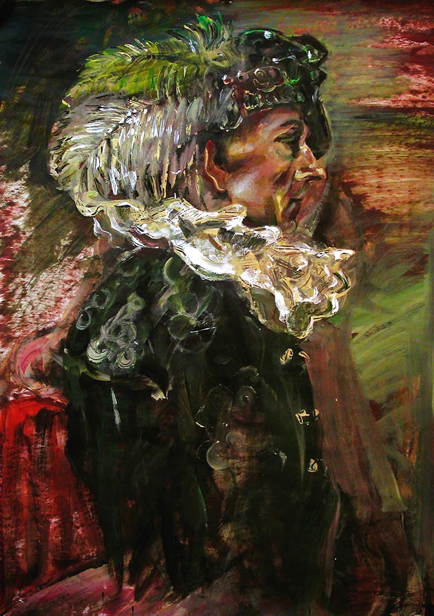 Une peinture acrylique rapide sur papier, d'un manequin vétu d'une tenue entièrement doublée et galonnée au style de Renaissance. Peint comme un dessin.