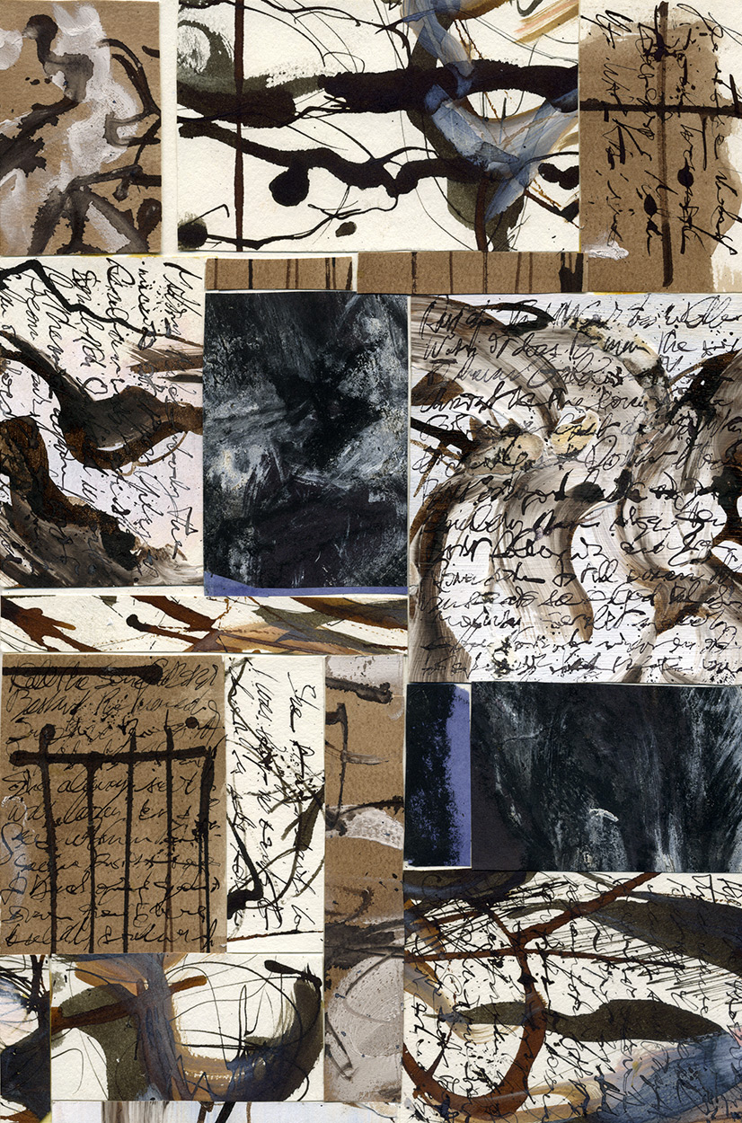Composition mixte de morceaux de dessins d'encre et d'écriture, un effet dynamique par le trait et la juxtaposition. Le sujet de la composition est l'encre sépia.