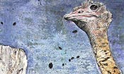 Peinture TXBRUT d'autruche, composée de peinture à l'huile, pigments, terre, branchage, écorces et ivoire végétale. Sujet : l'autruche d'Afrique.