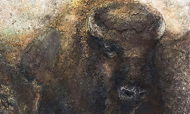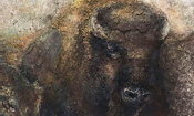 Peinture TXBRUT d'un bison dans une ruée sauvage, un petit à ses côtés, composée de peinture, pigments, terre et écorces. Sujet : Le grand mâle.