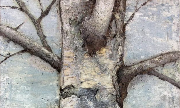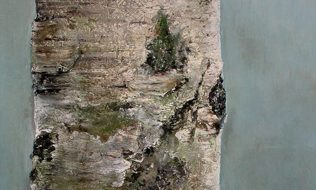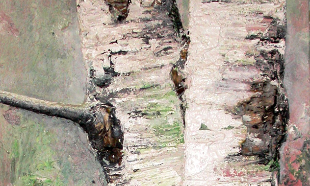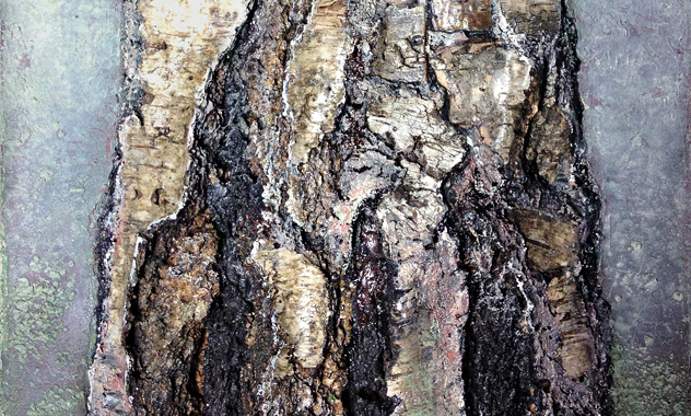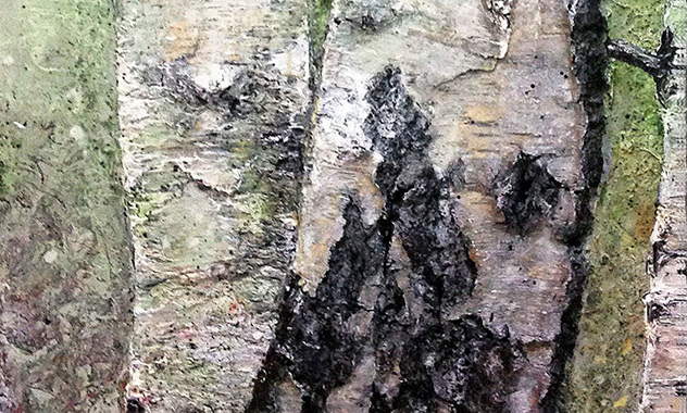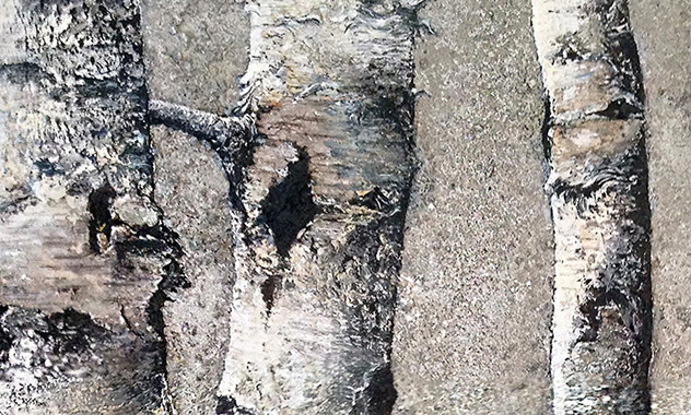 Peinture TXBRUT illustrant les bouleaux, composée de peinture à l'huile, pigments, terre, sable et écorces. Sujet : bouleaux d'âges différents.