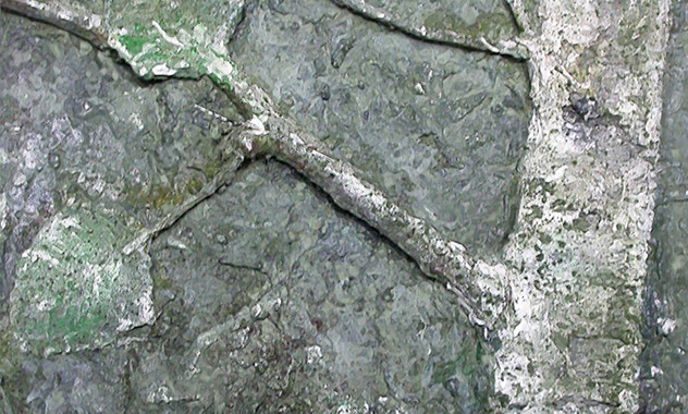 Peinture TXBRUT de bouleau nain partir de son tronc, composée de peinture, pigments, terre, sable, branchage et écorces. Sujet : La texture du pied.