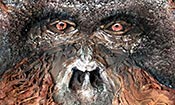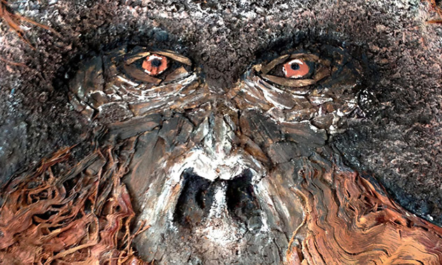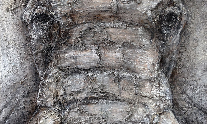 Peinture TXBRUT de pachyderme africain, composée de peinture, pigments, terre, branchage et écorces. Sujet : Le vieil éléphant avec ses rides.
