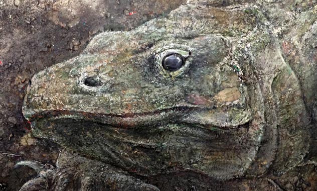 Peinture TXBRUT de varan d'Indonésie, composée de peinture, pigments, terre, sable, branchage et écorces. Sujet : Le varan à la recherche de nourriture.