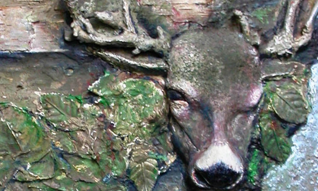 Peinture TXBRUT de vase en pierre, composée de peinture, pigments, terre, branchage et écorces. Sujet : Pot décoré de végétation et de tête sculptée de cerf.