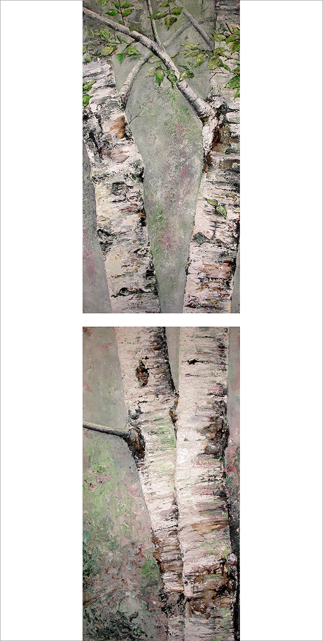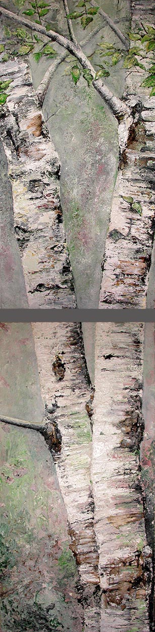 Bouleaux I : 45 x 205 cm - peinture TXBRUT de bouleaux penchés (en deux toiles), composée de peinture à l'huile, pigments, terre, sable, branchage et écorces. Sujet : Les bouleaux et leurs formes.