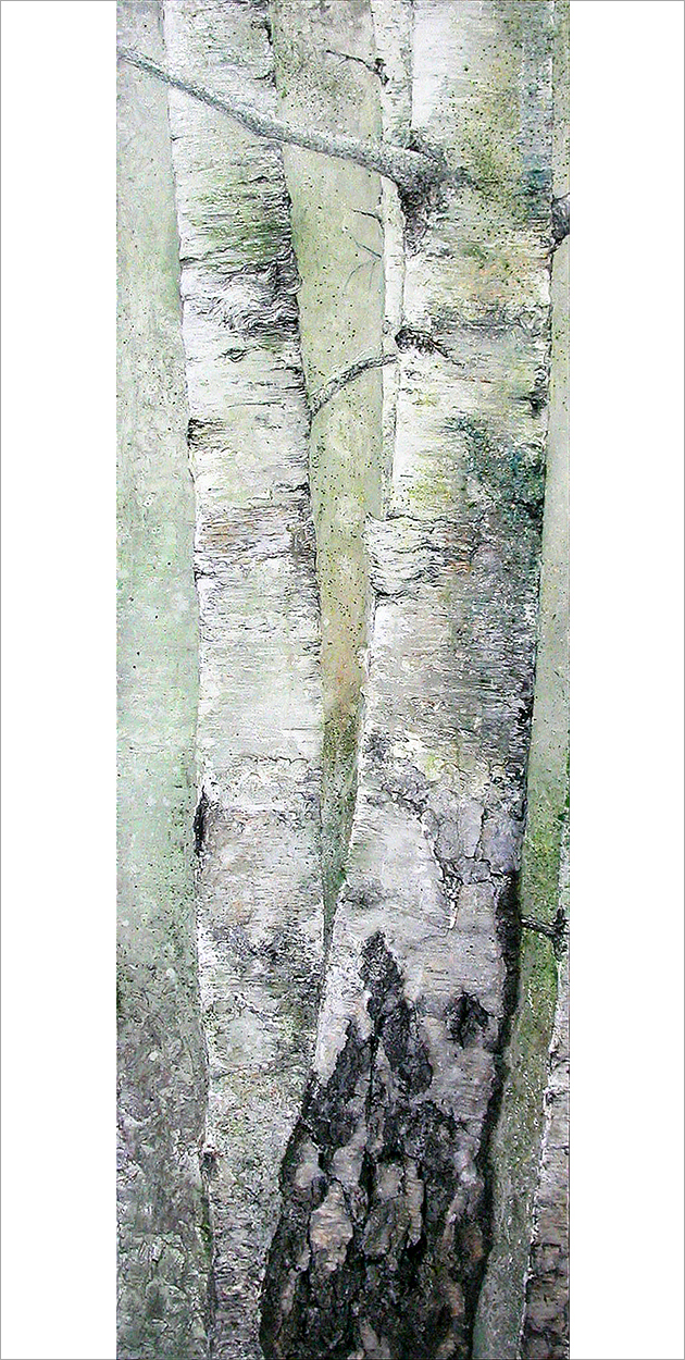 Bouleaux VI : 60 x 200 cm - peinture TXBRUT de bouleaux, échelle 100%, composée de peinture à l'huile, pigments, terre de forêts, sable, branchage et écorces. Sujet : Bouleau âgé et bouleaux plus jeunes.