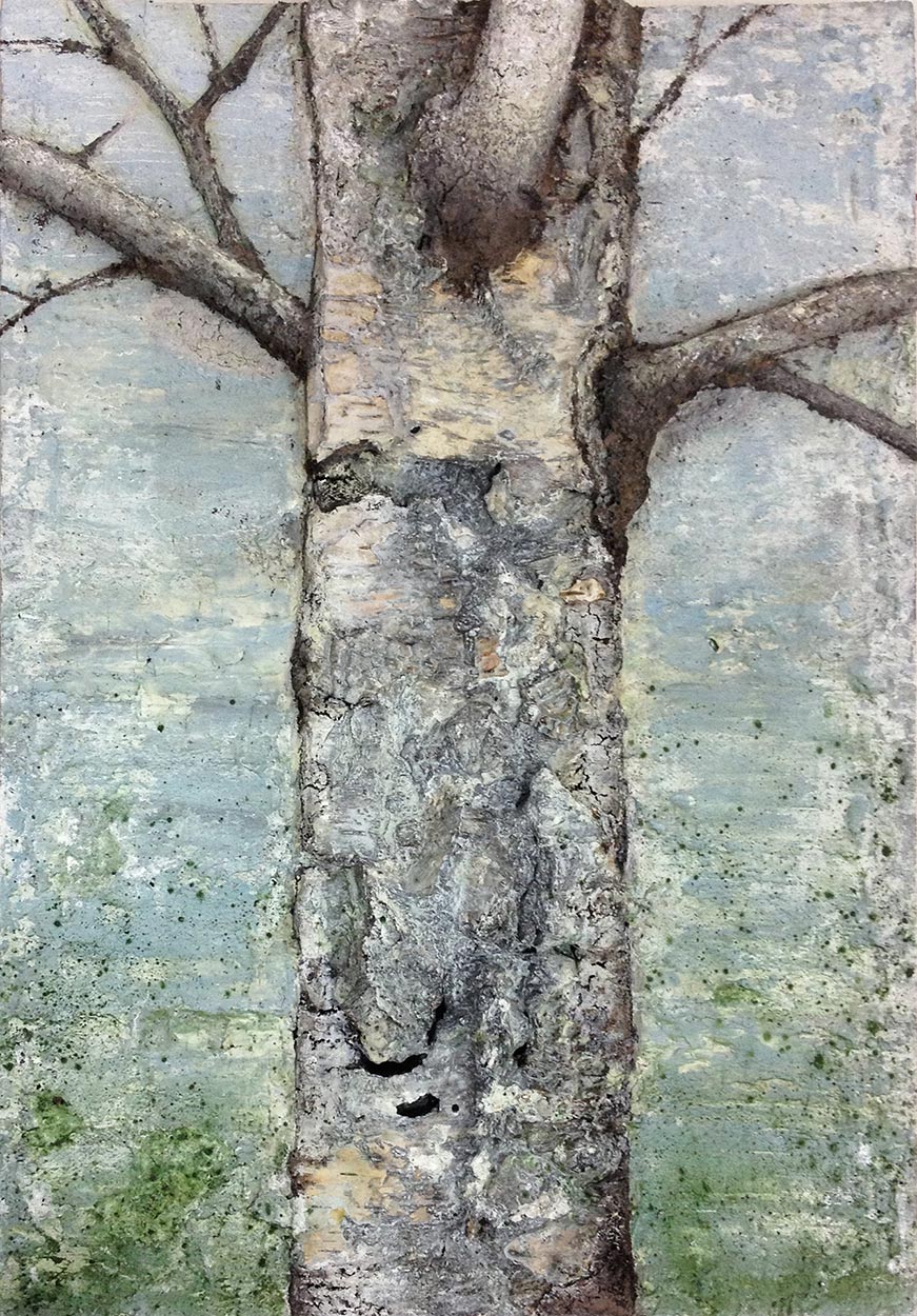 Bouleau de Jour : 50 x 62 cm - peinture TXBRUT de bouleau et de son branchage, composée de peinture à l'huile, pigments, terre, sable, branchage et écorces. Sujet : Le bouleau dans la journée.